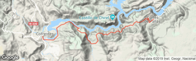 Una ruta de gran interés paisajista y deportivo. Con terreno muy variado con tramos largos de sendero, pistas y asfalto. Los senderos suponen 3.5 kms . de los cuales son ciclables entre un 50% al 75% dependiendo de la destreza del Biker. Un impresionante recorrido aéreo sobre el curso del río Jucar que en este tramo ya se ven apaciguadas sus aguas, en su peregrinar hacia el mar, por la presa de Cortes distinguiendo, en la orilla contraria, el Castillo de Chirel desde el que se controlaba a los moriscos que se agrupaban en La Muela de Cortes cuando su expulsión de España y embarcarlos hacia África.