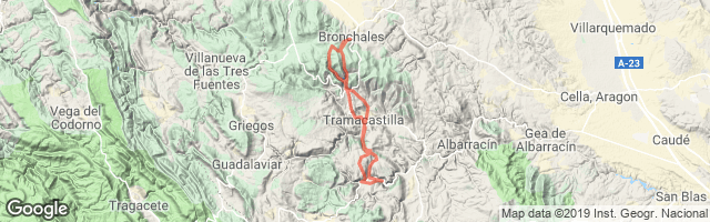 Ruta que sale de Bronchales por la fuente del Pilar , sube hasta la carretera del cantoo para luego bajar hasta Noguera por el Portichuelo y la Fuente de la Rosa y desde allí tomar la zona de Rodeno hasta Tramacastlla . Bordeando el Guadalaviar hasta el ascenso hacia Calomarde al que se llega tras un prolongado descenso. Visitaremos em paraje de Molino Viejo , para volver a subir por otra pista y descender a Tramacastilla por la misma que hemos venido , y por carretera volver a Noguera. Subiremos de vuelta a Bronchales por la Fuente de los Maquis , para dejarnos caer al pueblo por la senda o por la pista del Pilar.