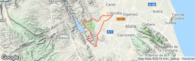 La ruta se inicia en La Alcudia, por carreteras secundarias se llega al canal Jucar-Turia del que nos separamos para subir por pistas hasta la cota máxima (380m). Bajamos al embalse de Tous y, de nuevo por carretera vamos paralelos al Júcar en el que podemos darnos un baño, en el Azud de Antella. Carreteras secundarias nos llevan, entre campos de naranjas y canales, hasta nuestro punto de origen.