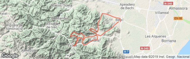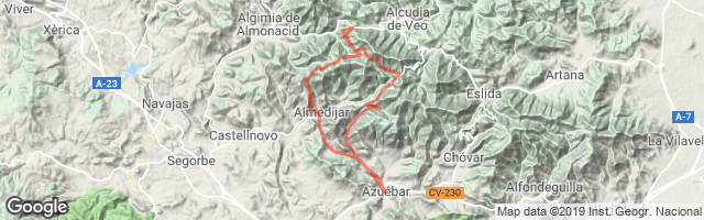 Ruta que recorre magníficos rincones de la sierra de Espadán. Sale de azuebar hacia Almedijar, subidas suaves para ir calentando. A partir de subida largo puerto con pendiente constante en dirección al pico Espadán. Tras visitarl la cava se vuelve para dirigirse hacia la carretera Ahín Almedijar. A mitad de la bajada se coje un desvío a la izquierda que nos llevará a al barranco de la Mosquera, para acabar la ruta con buen sabor de boca.