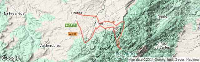 Sale de Cretas y hasta Arnes va con la ruta sin sendas. Depues se desvia a buscar la primera senda al par de kilometros de pasar Arnes, y de alli sera un no parar de Sendas, incluyendo la entrada por la senda dels Estrets. Se almorzara tambien en el merendero de Horta, y se saldra por la senda del Riuet de les valls, despues se pasara por el toll del vidre y hara otro par de sendas hasta llegar el bolet por donde ya por caminos llegaremos a Cretas.